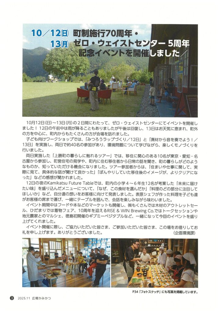 上勝町町制施行70周年と上勝町ゼロ・ウェイストセンター設立5周年を記念して、上勝町ゼロ・ウェイストセンターでは、マルシェやワークショップ、移住体験ツアー、Kamikatsu Future Tableなどが開催されました。(上勝町は昭和30年7月20日に旧福原村と旧高鉾村が合併し現在の上勝町が誕生)